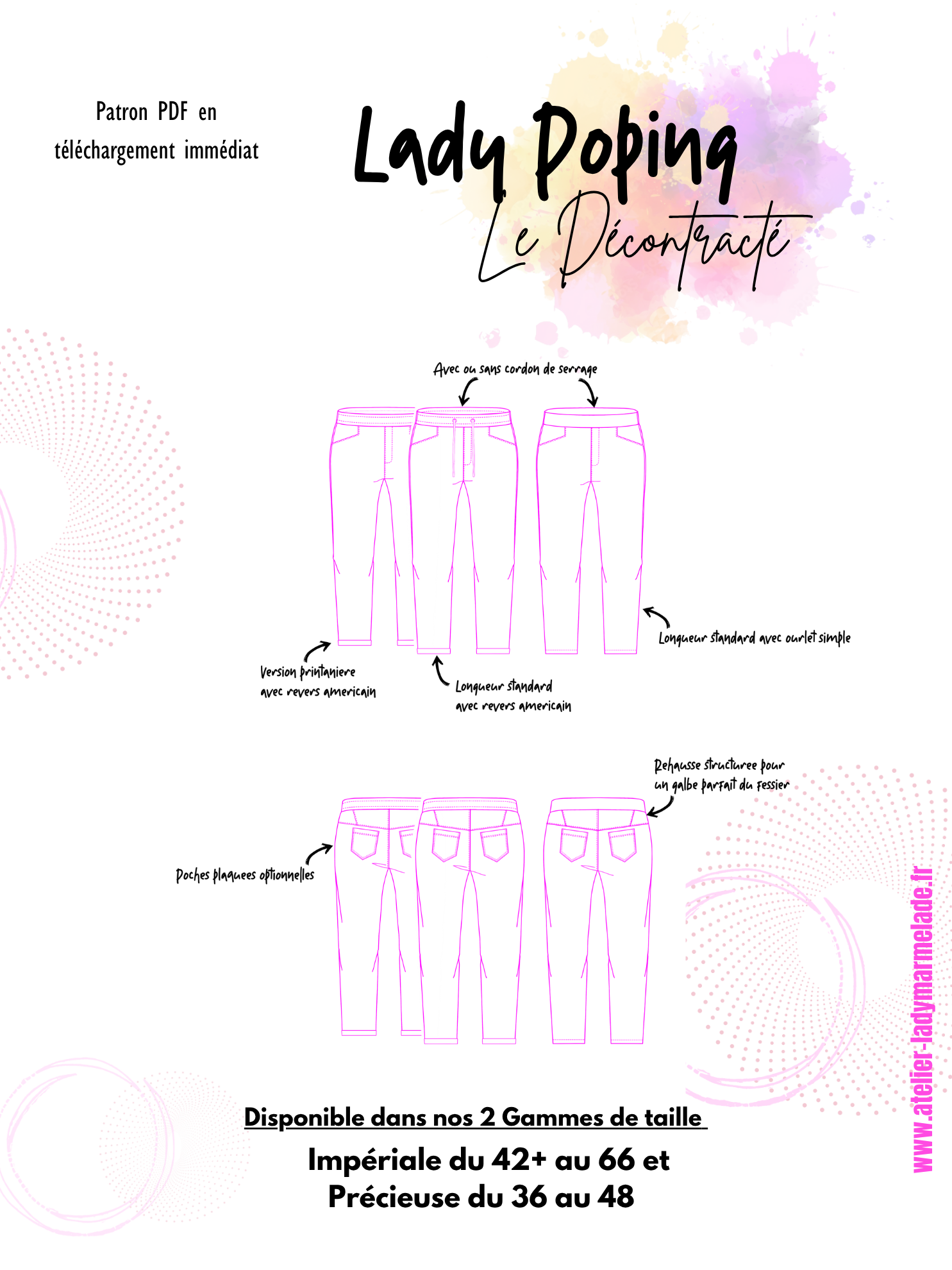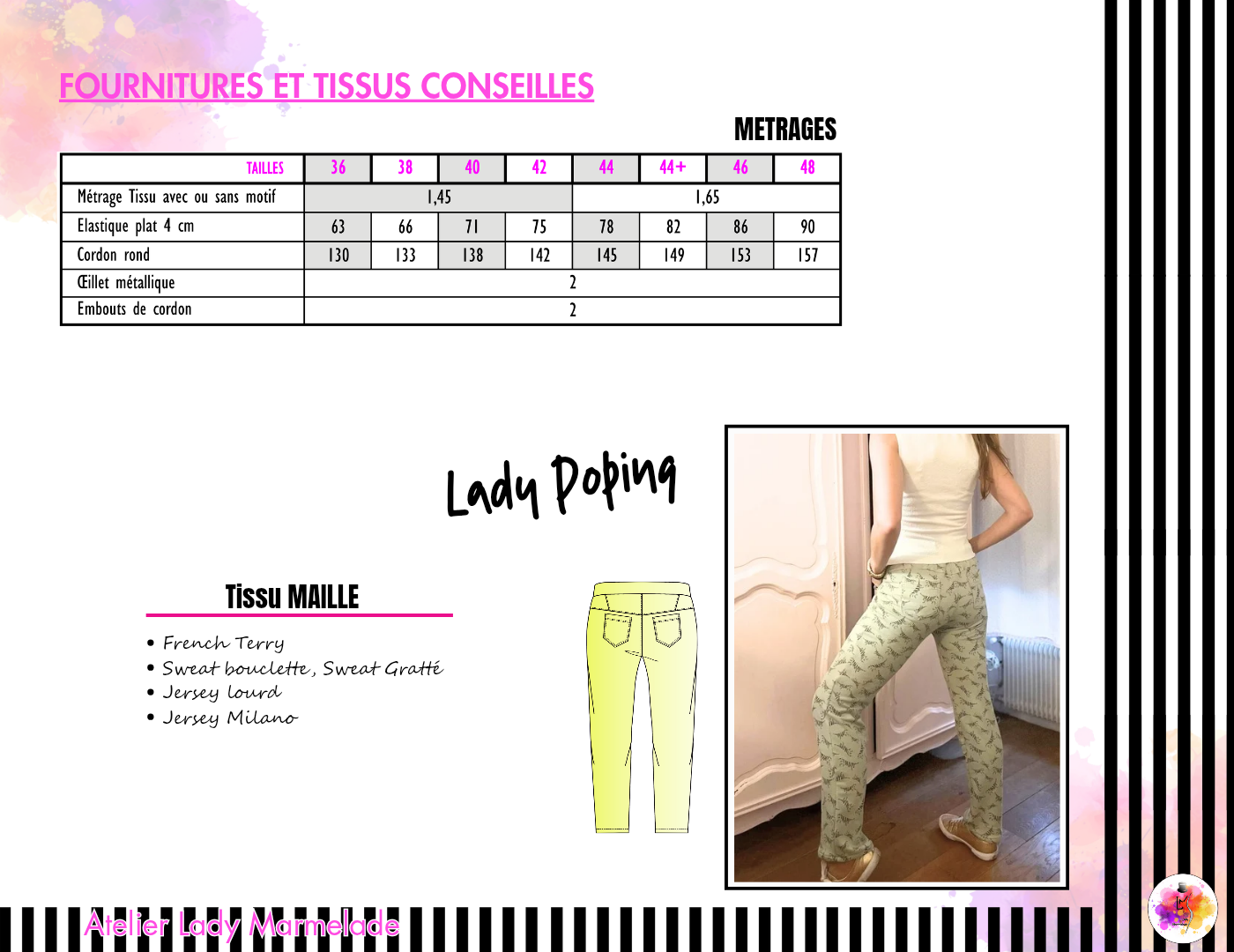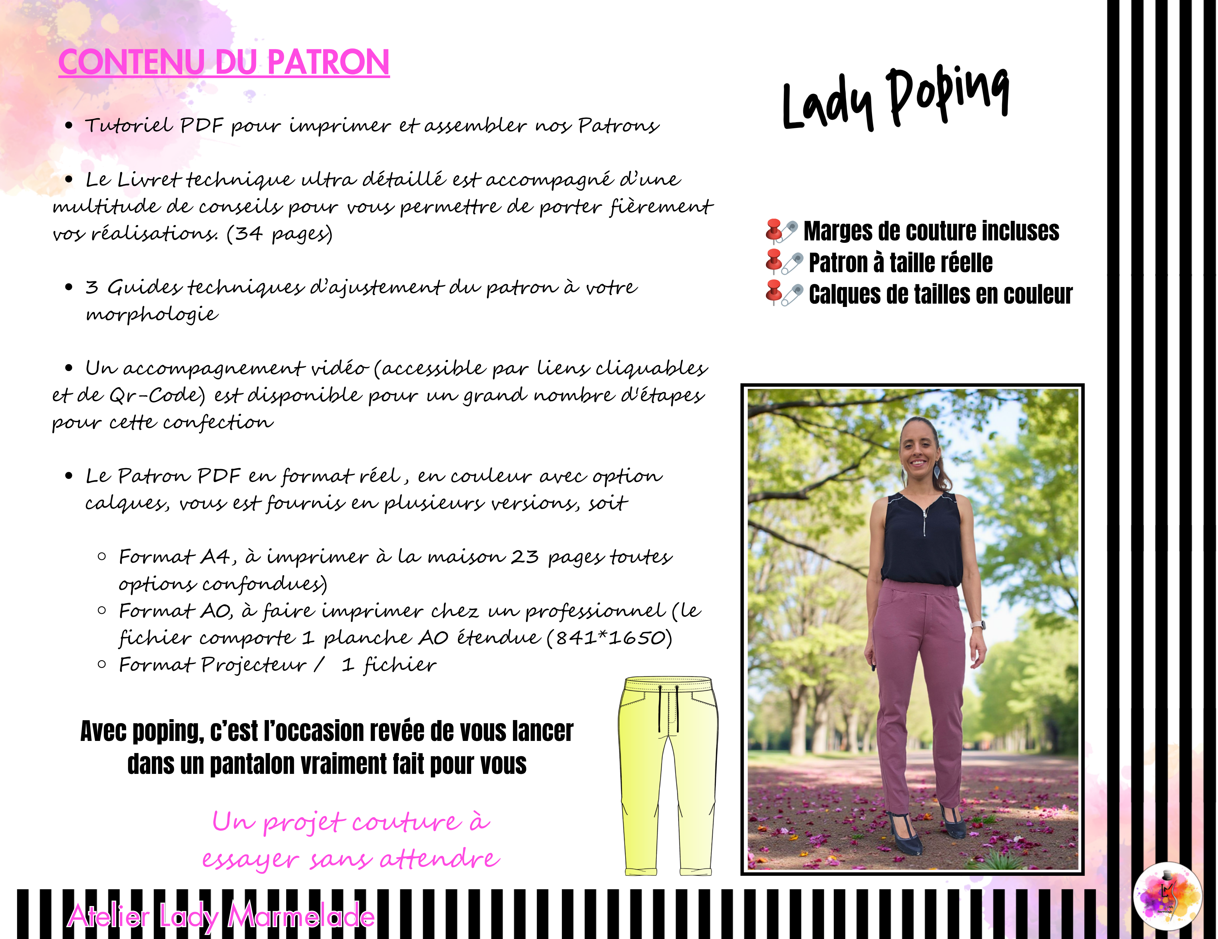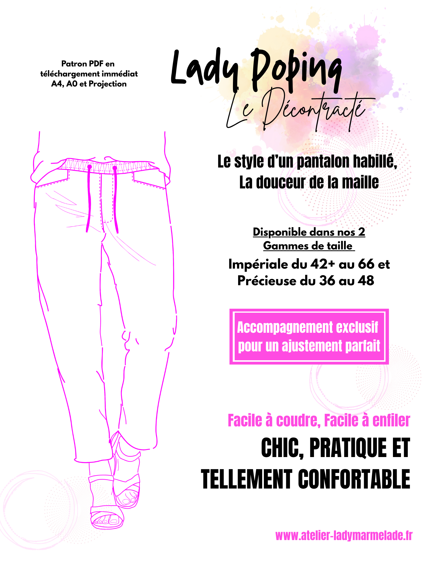 Poping est le pantalon qui conjugue allure et confort. Sa coupe Chino modernisée s’adapte aux tissus extensibles pour suivre vos mouvements sans contrainte. Facile à coudre grâce à sa ceinture élastiquée et sa fausse braguette, il permet même aux couturières peu expérimentées d’oser leur premier pantalon. Résultat : une pièce intemporelle, déclinable au gré des saisons et des envies.